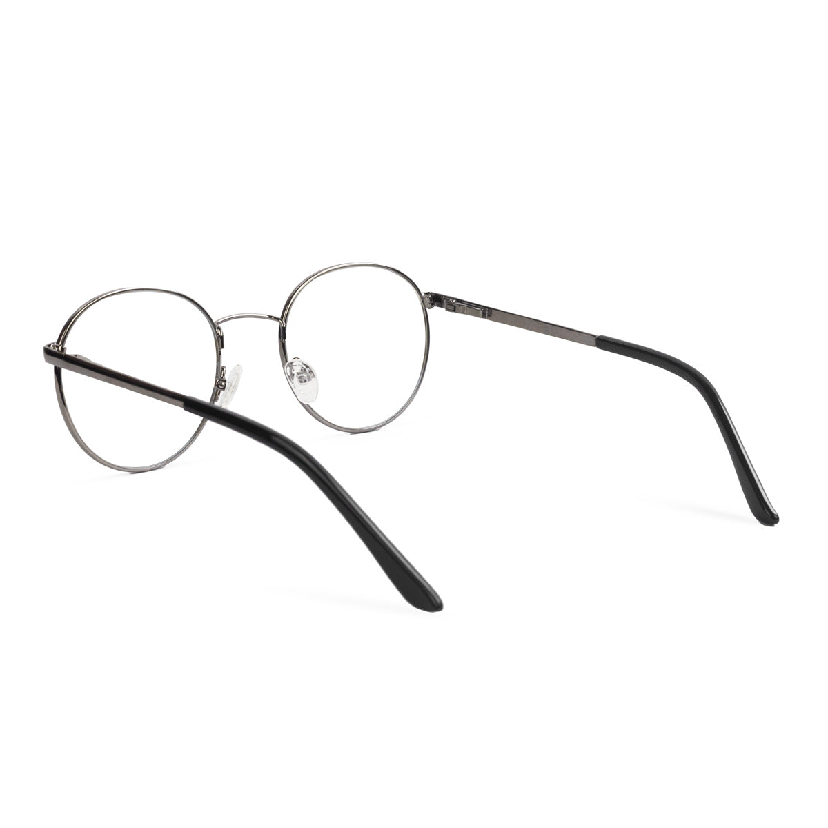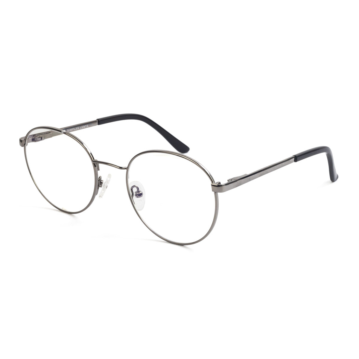 Óculos de metal titanium leve e discreto com design redondo clássico. Possui plaquetas flexíveis de silicone e ponteira de acetato na haste que permite se adaptar bem a diferentes rostos e narizes.