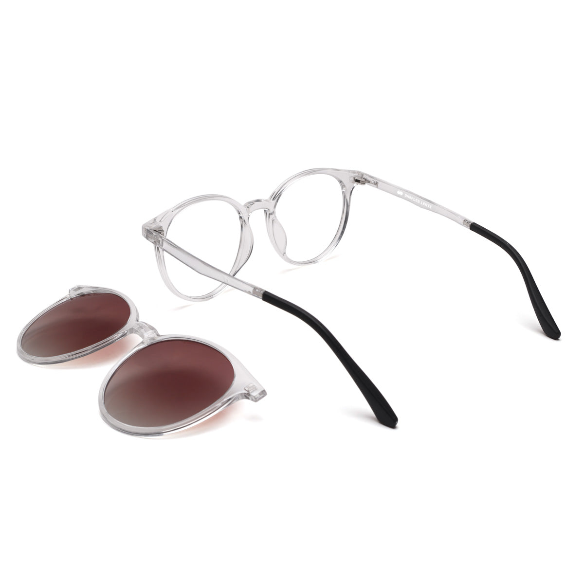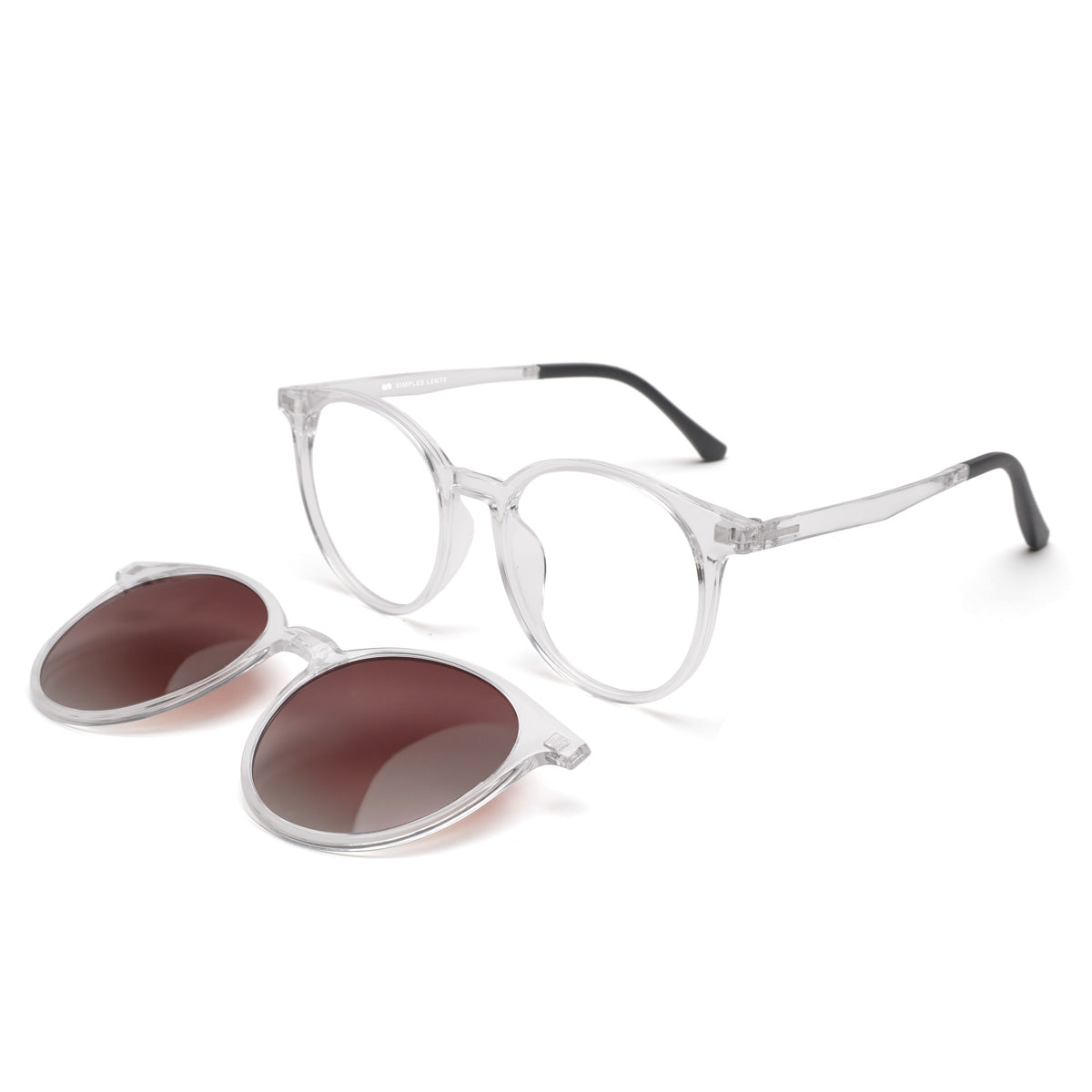 Este modelo de óculos apresenta um design redondo em tamanho grande, ideal para quem prefere armações com mais presença. Acompanha clip-on solar com encaixe magnético, que transforma seus óculos de grau em óculos escuros em segundos. Versátil e funcional, é a escolha perfeita para quem busca conforto, praticidade e um visual atemporal com personalidade.