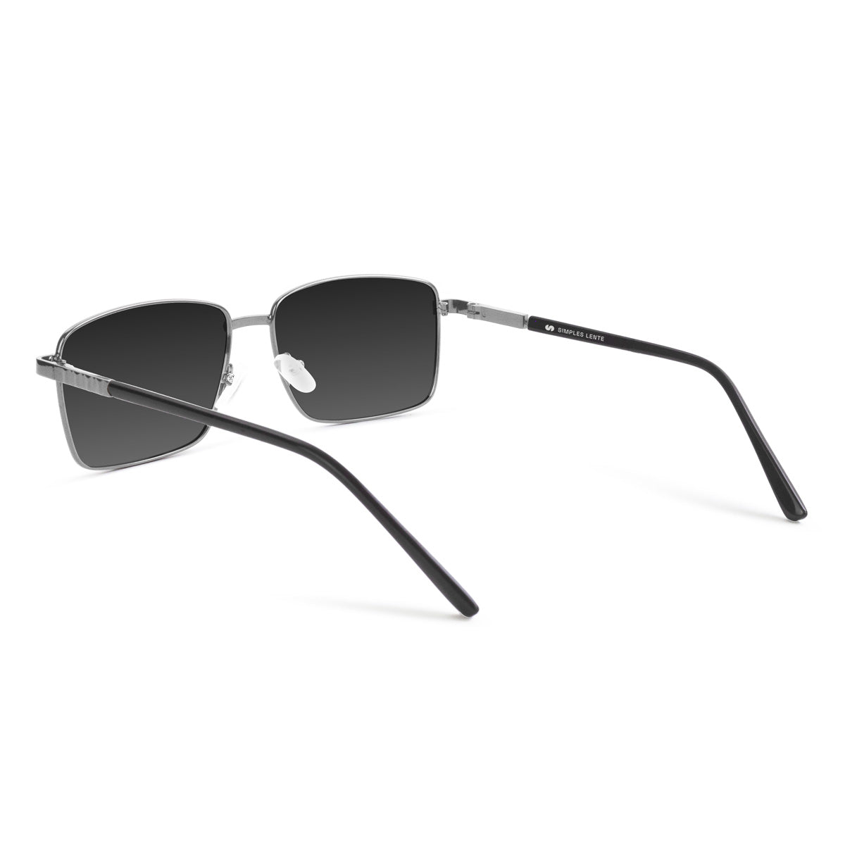 Óculos em metal leve e elegante, com design quadrado clássico que combina modernidade e versatilidade. Possui plaquetas ajustáveis de silicone e ponteiras em acetato nas hastes, proporcionando conforto e adaptabilidade para diferentes tipos de rosto e formatos de nariz.