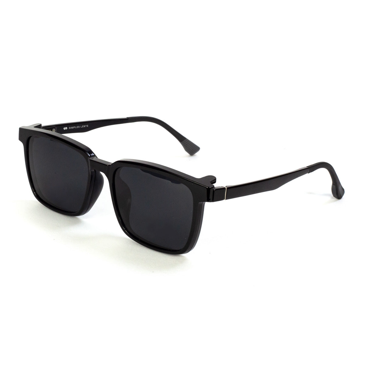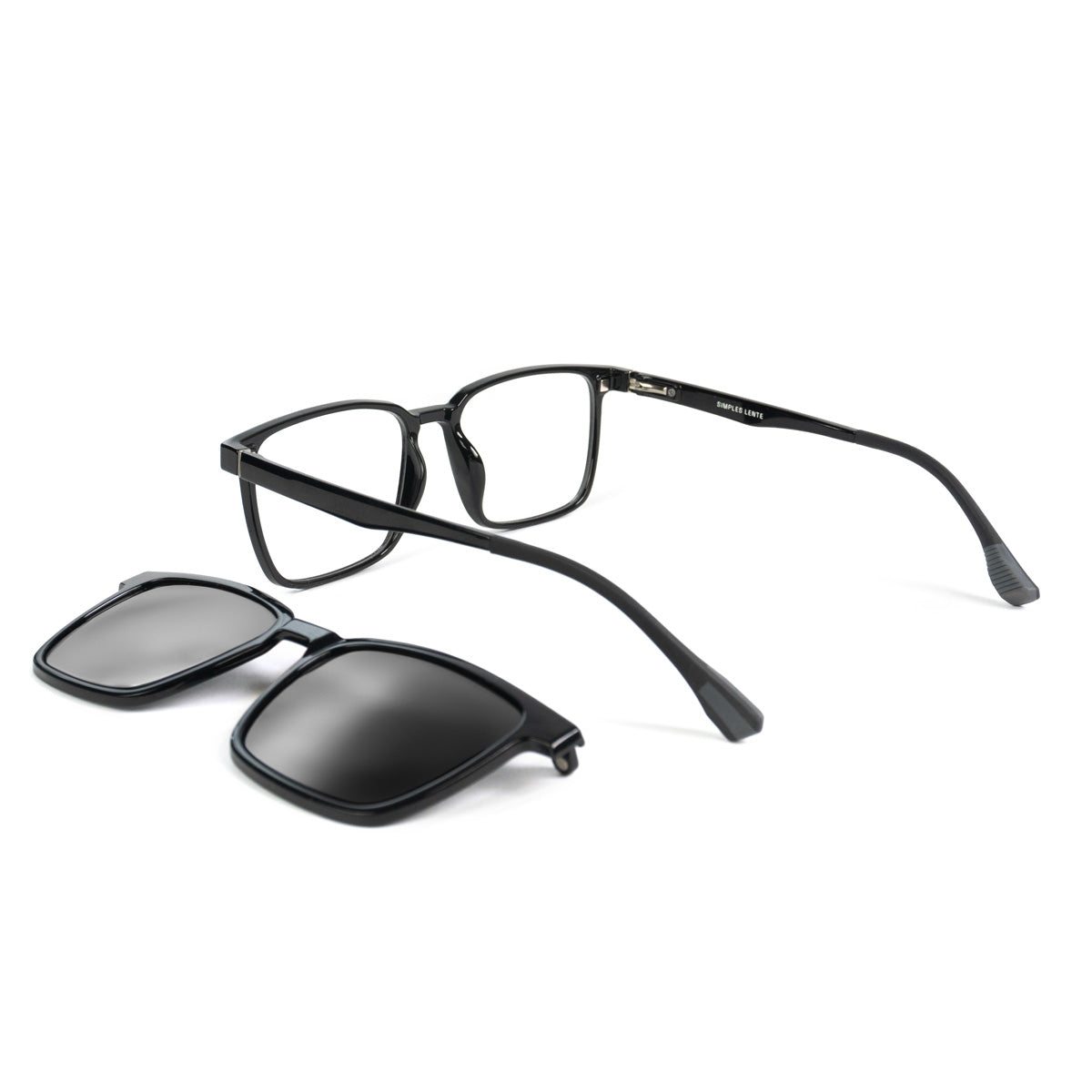 Design quadrado médio clássico com clip-on que transforma seu óculos de grau em óculos solar.