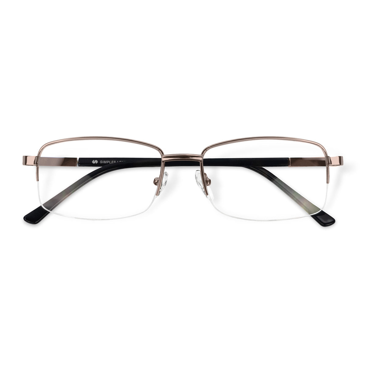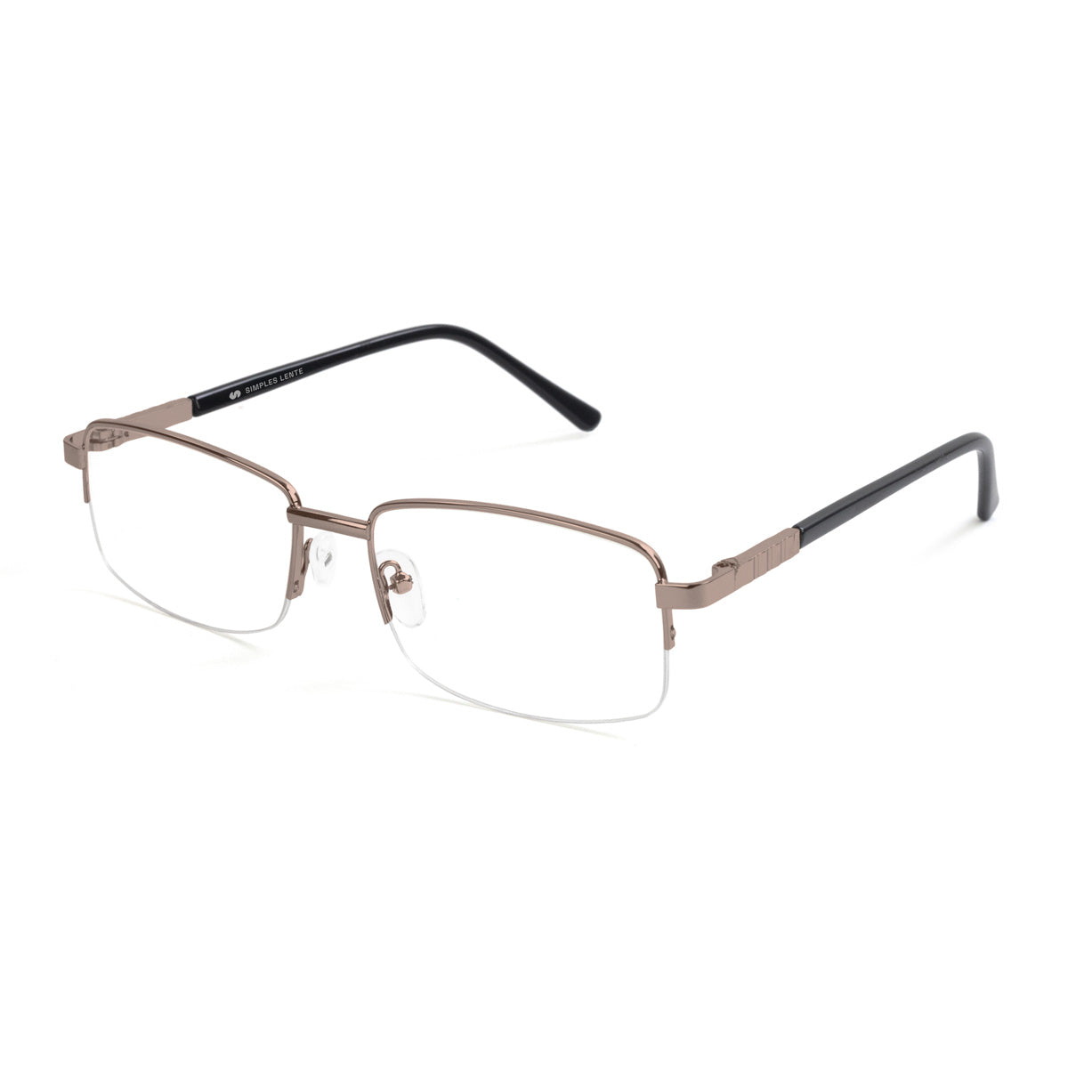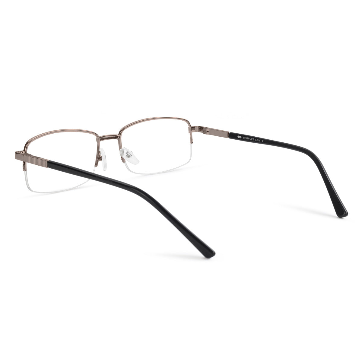Óculos de meio aro com armação em metal, em formato retangular e tamanho médio, projetado para unir leveza e modernidade. Suas hastes possuem ponteiras em acetato, e as plaquetas de silicone são ajustáveis, oferecendo um encaixe confortável e adaptável a diferentes formatos de rosto. Ideal para quem busca um acessório prático e elegante, que combina discrição e versatilidade no dia a dia.