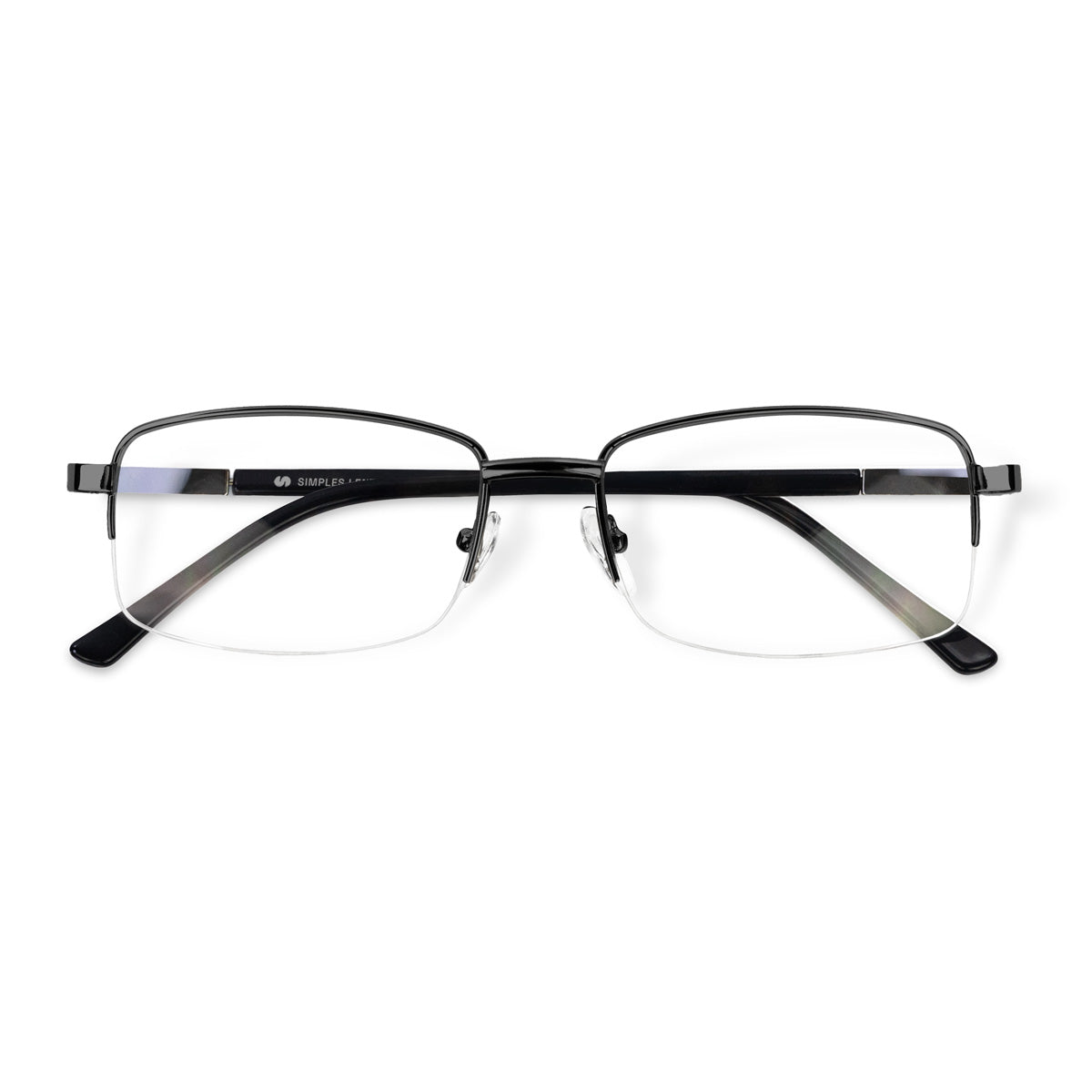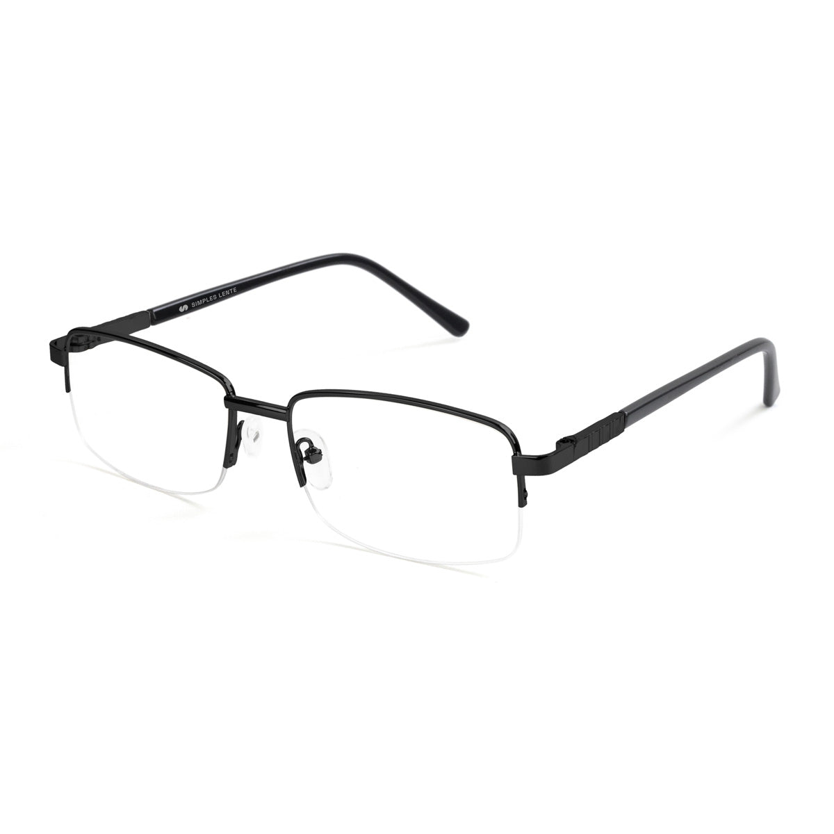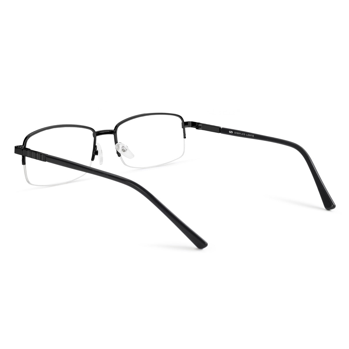 Óculos de meio aro com armação em metal, em formato retangular e tamanho médio, projetado para unir leveza e modernidade. Suas hastes possuem ponteiras em acetato, e as plaquetas de silicone são ajustáveis, oferecendo um encaixe confortável e adaptável a diferentes formatos de rosto. Ideal para quem busca um acessório prático e elegante, que combina discrição e versatilidade no dia a dia.
