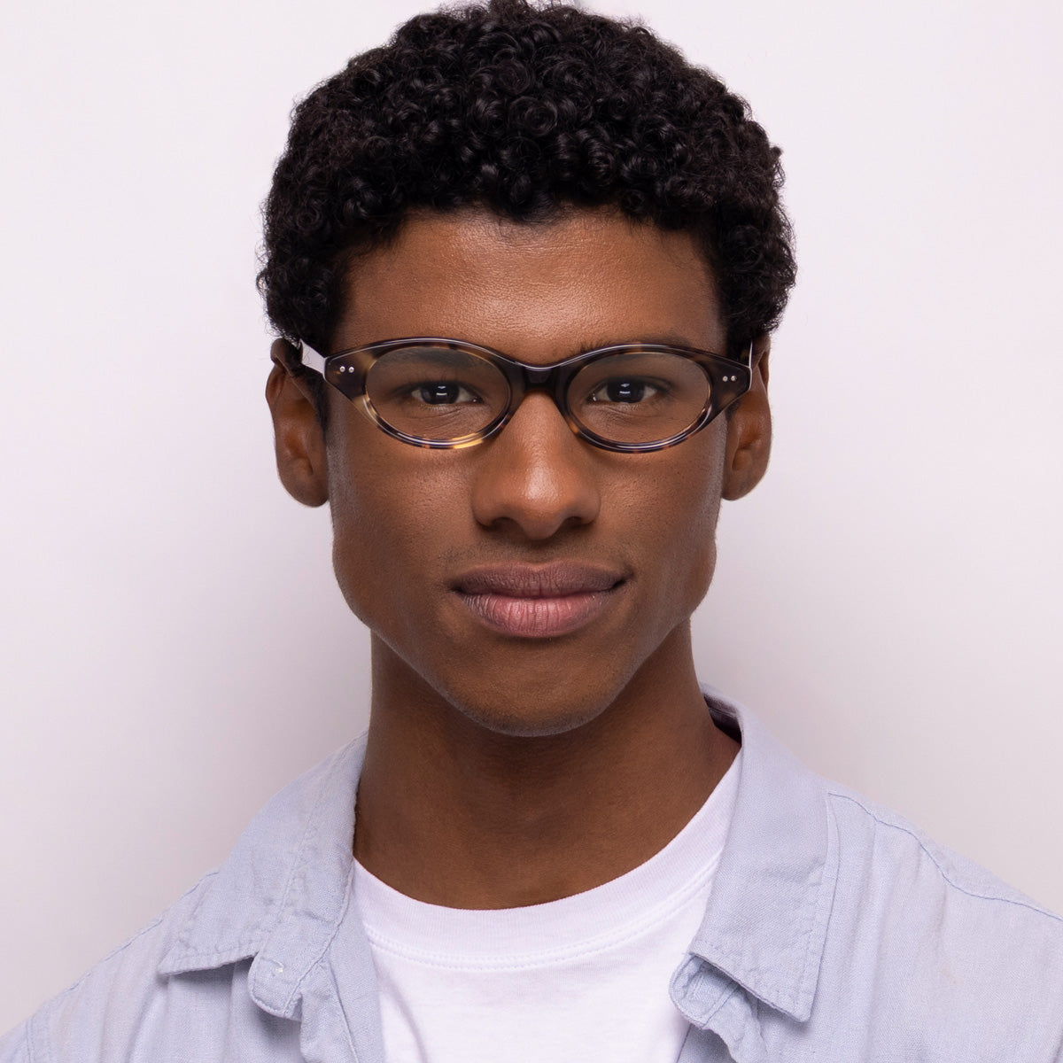 Óculos Geométrico Pequeno Tartaruga Bege G17 em modelo com rosto médio.