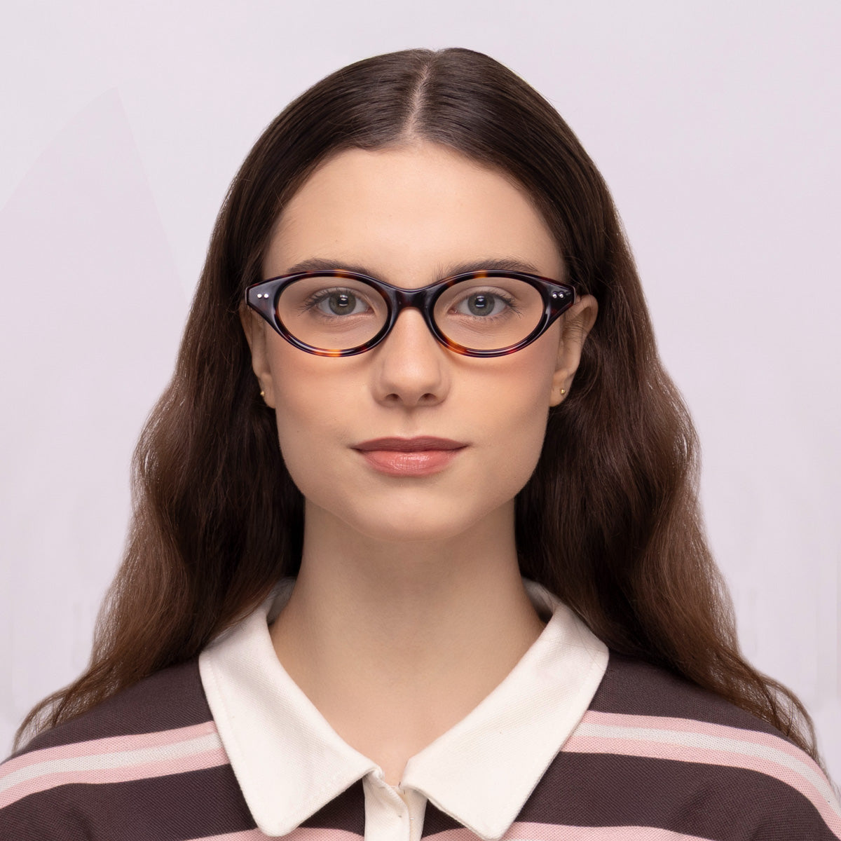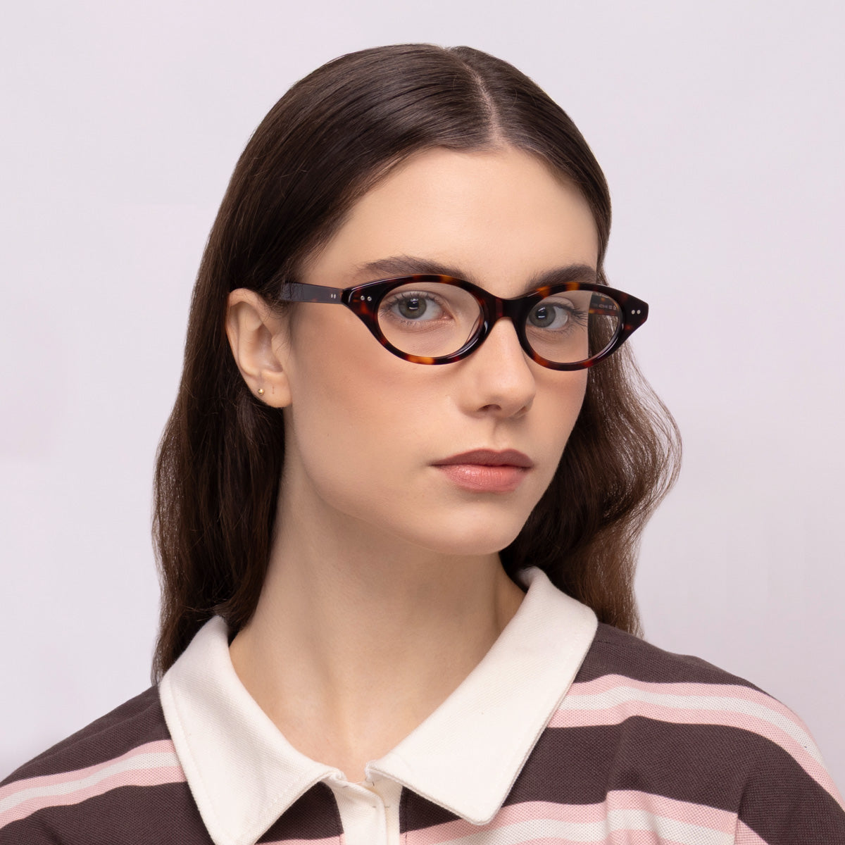 Óculos Geométrico Pequeno G17 Tartaruga em modelo com rosto pequeno.