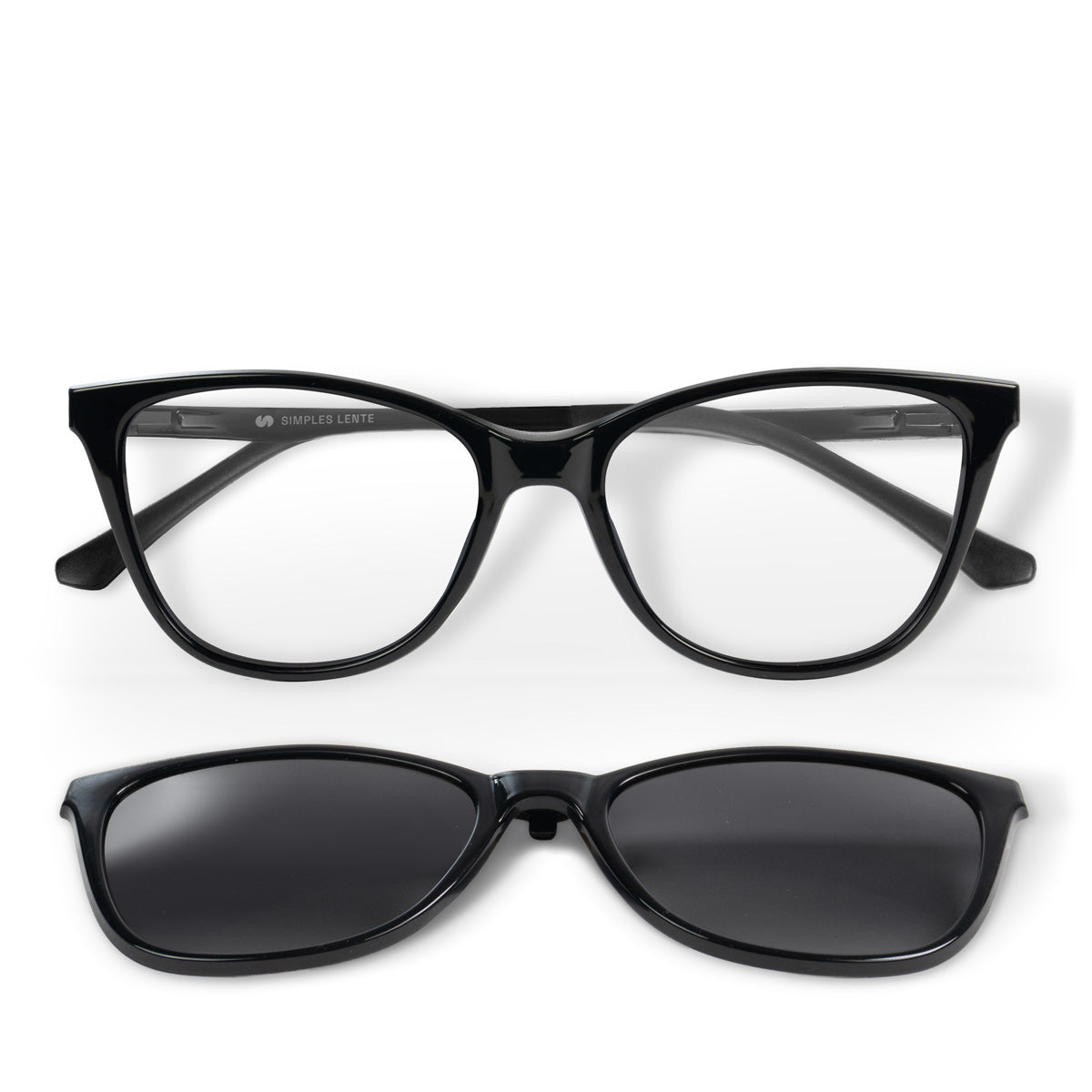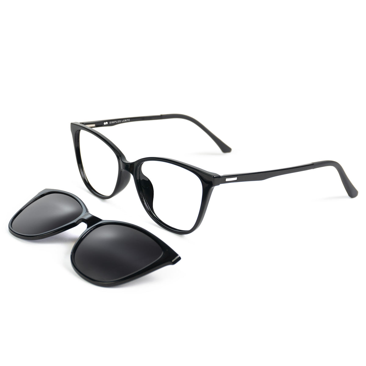 Design geométrico moderno com clip-on que transforma seus óculos de grau em óculos solar