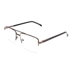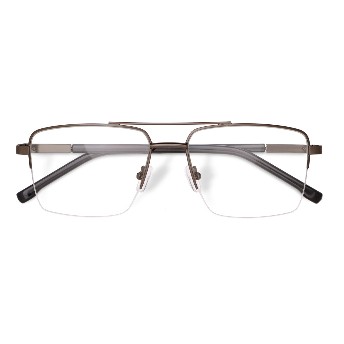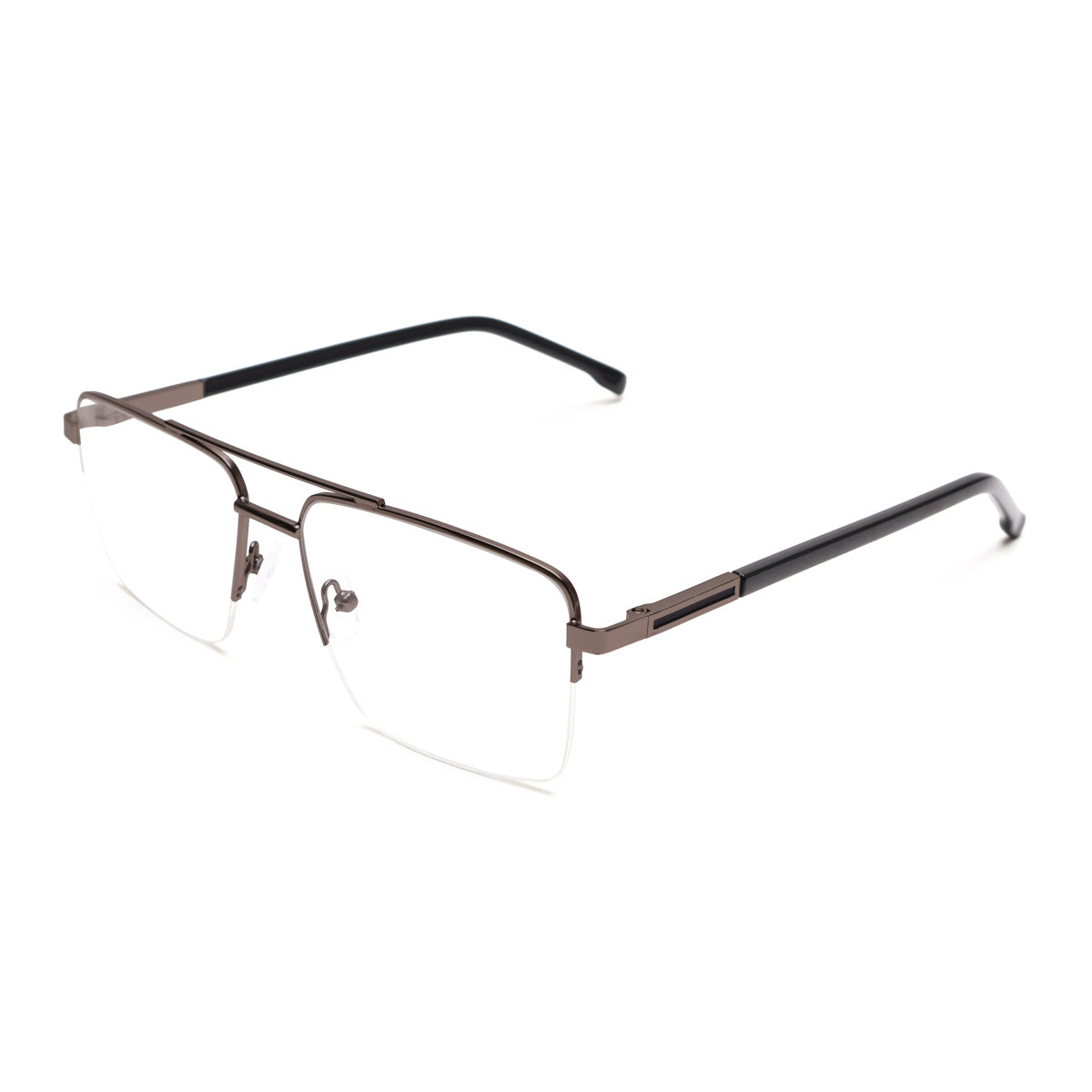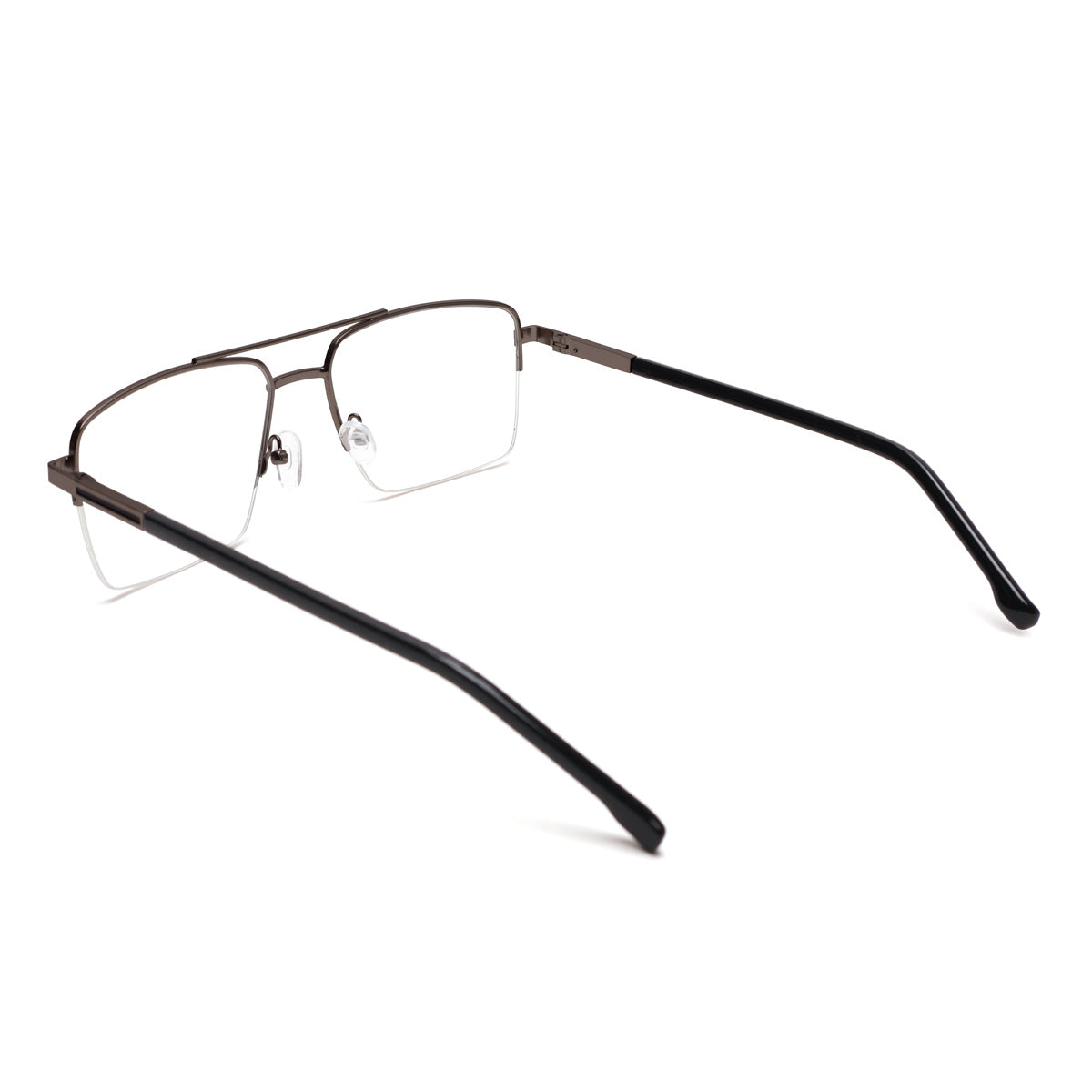 Óculos de metal aviador quadrado, de tamanho médio. Leve e versátil, seu design icônico apresenta uma estrutura resistente e confortável. Possui plaquetas flexíveis de silicone e ponteiras de acetato nas hastes, garantindo um ajuste preciso para diferentes formatos de rosto e nariz.