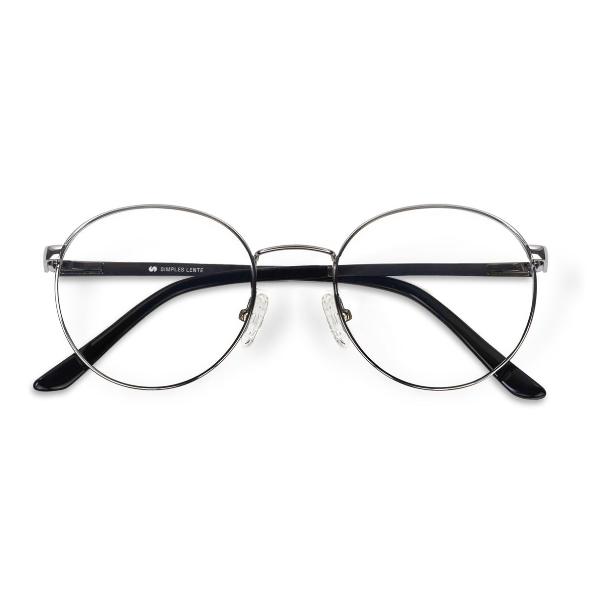 Óculos de metal titanium leve e discreto com design redondo clássico. Possui plaquetas flexíveis de silicone e ponteira de acetato na haste que permite se adaptar bem a diferentes rostos e narizes.