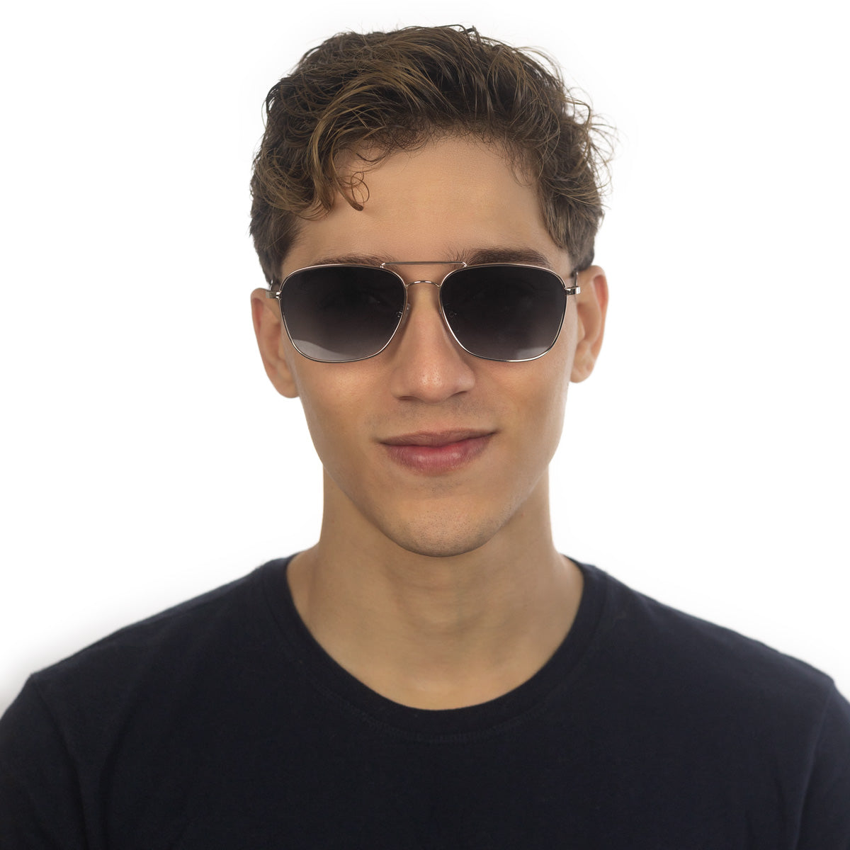 Óculos de metal aviador quadrado com lente reversa, de tamanho médio. Leve e versátil, seu design icônico apresenta estrutura resistente e confortável. Possui plaquetas flexíveis de silicone e ponteiras de acetato nas hastes, garantindo um ajuste preciso para diferentes formatos de rosto e nariz.