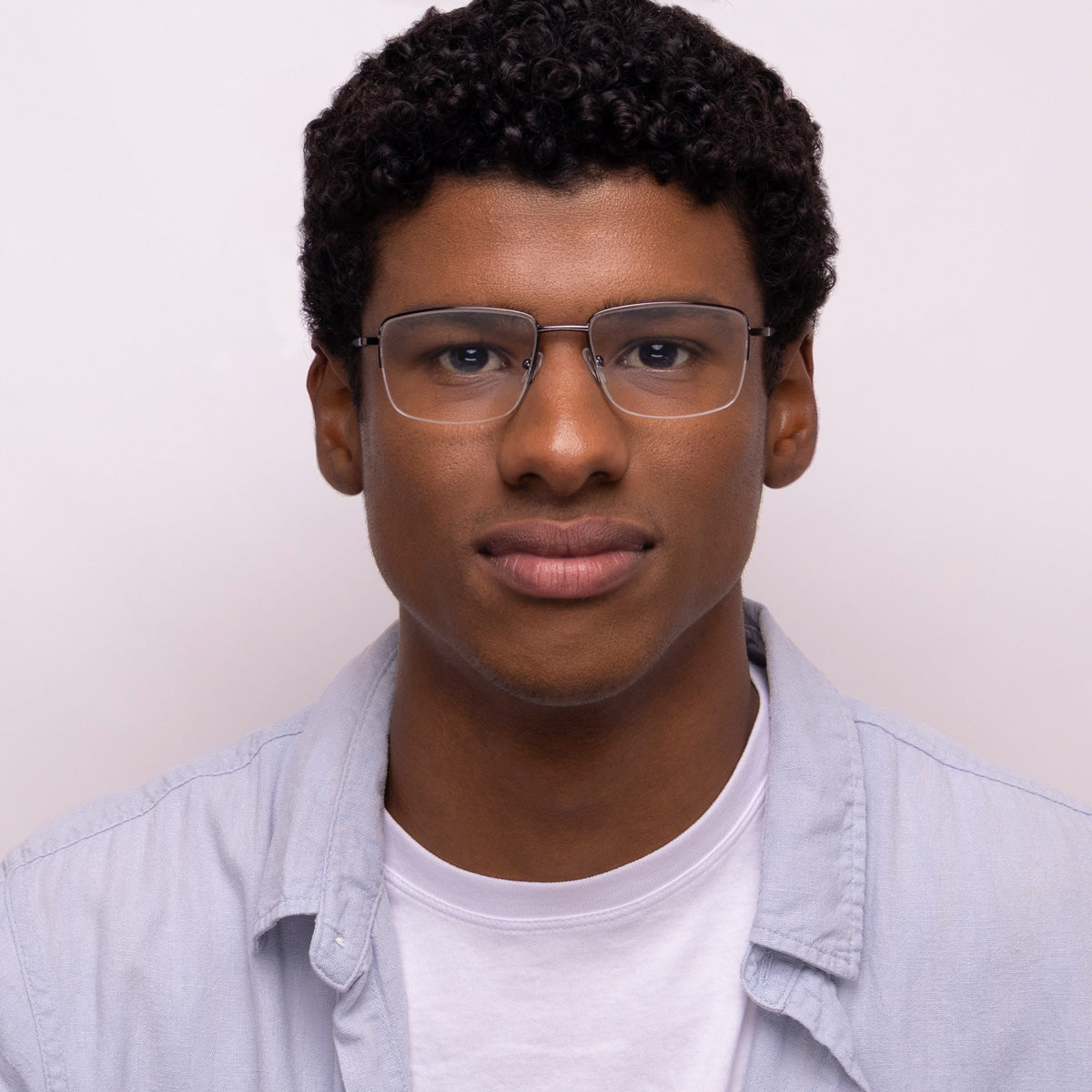 Óculos de meio aro com armação em metal, em formato retangular e tamanho médio, projetado para unir leveza e modernidade. Suas hastes possuem ponteiras em acetato, e as plaquetas de silicone são ajustáveis, oferecendo um encaixe confortável e adaptável a diferentes formatos de rosto. Ideal para quem busca um acessório prático e elegante, que combina discrição e versatilidade no dia a dia.