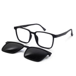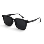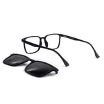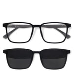 Design quadrado médio clássico com clip-on que transforma seu óculos de grau em óculos solar.