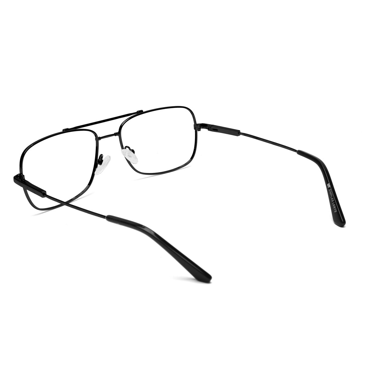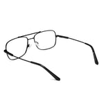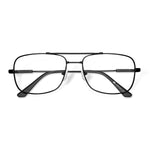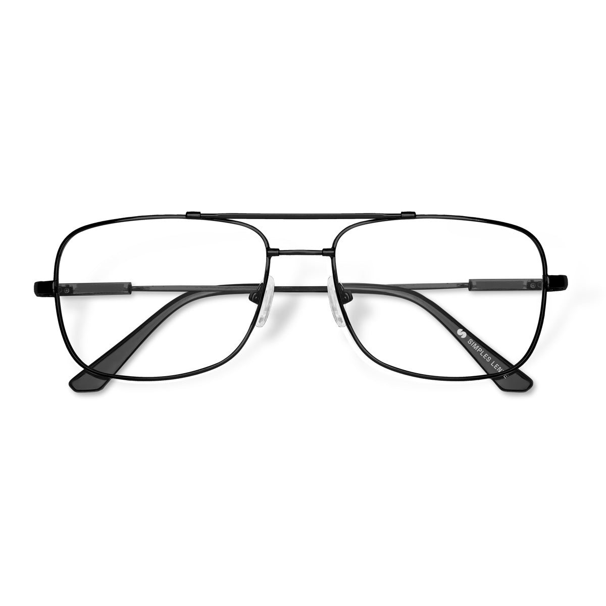 Óculos de metal aviador quadrado, de tamanho médio. Leve e versátil, seu design icônico apresenta uma estrutura resistente e confortável. Possui plaquetas flexíveis de silicone e ponteiras de acetato nas hastes, garantindo um ajuste preciso para diferentes formatos de rosto e nariz.