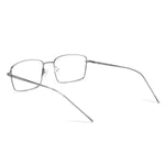 Óculos em metal titânio ultraleve e sofisticado, com design quadrado atemporal. Conta com plaquetas ajustáveis de silicone e ponteiras em acetato nas hastes, garantindo máximo conforto e adaptabilidade para variados formatos de rosto e tipos de nariz.