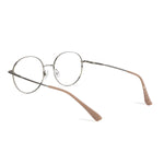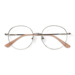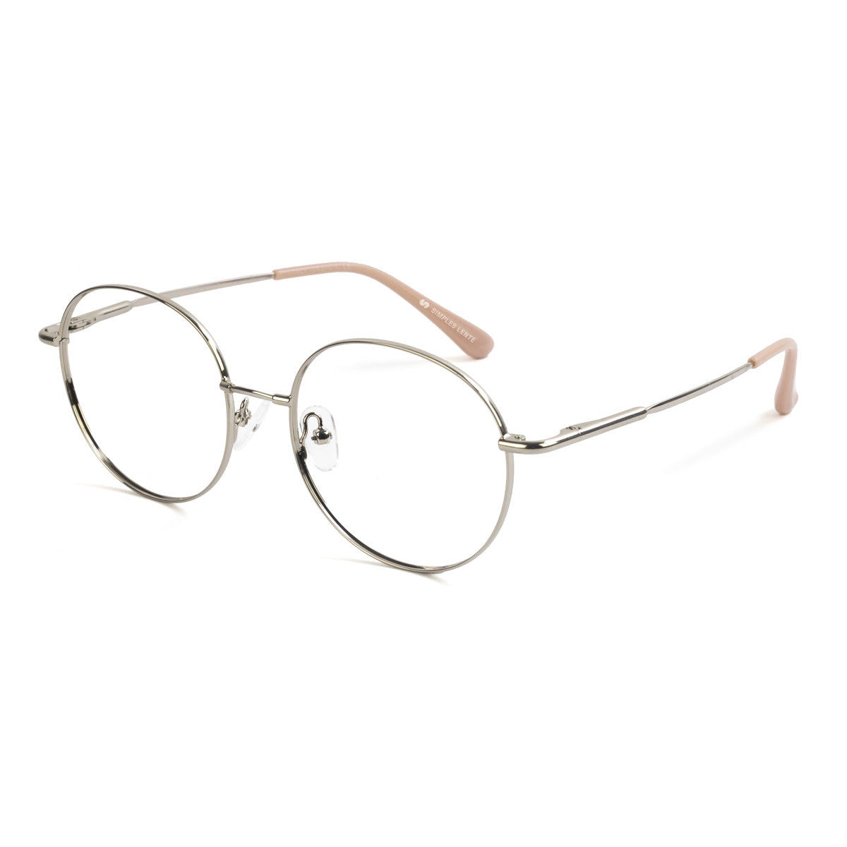 Óculos em metal titânio leve e sofisticado, com design redondo clássico e atemporal. Equipado com plaquetas flexíveis de silicone e ponteiras de acetato nas hastes, oferece excelente adaptabilidade e conforto para diversos tipos de rosto e formatos de nariz.
