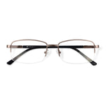 Óculos de meio aro com armação em metal, em formato retangular e tamanho médio, projetado para unir leveza e modernidade. Suas hastes possuem ponteiras em acetato, e as plaquetas de silicone são ajustáveis, oferecendo um encaixe confortável e adaptável a diferentes formatos de rosto. Ideal para quem busca um acessório prático e elegante, que combina discrição e versatilidade no dia a dia.