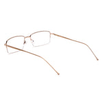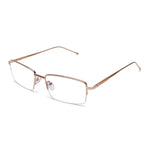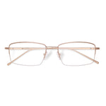 Óculos de meio aro com armação em metal, em formato retangular e tamanho médio, projetado para unir leveza e modernidade. Suas hastes possuem ponteiras em acetato, e as plaquetas de silicone são ajustáveis, oferecendo um encaixe confortável e adaptável a diferentes formatos de rosto. Ideal para quem busca um acessório prático e elegante, que combina discrição e versatilidade no dia a dia.