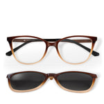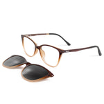 Design geométrico moderno com clip-on que transforma seus óculos de grau em óculos solar