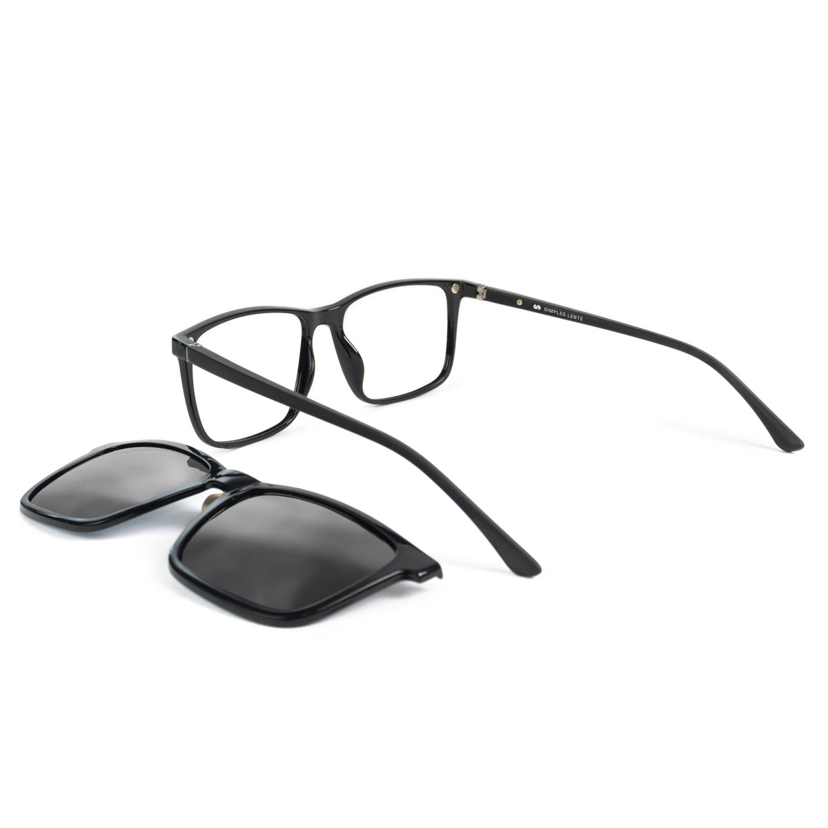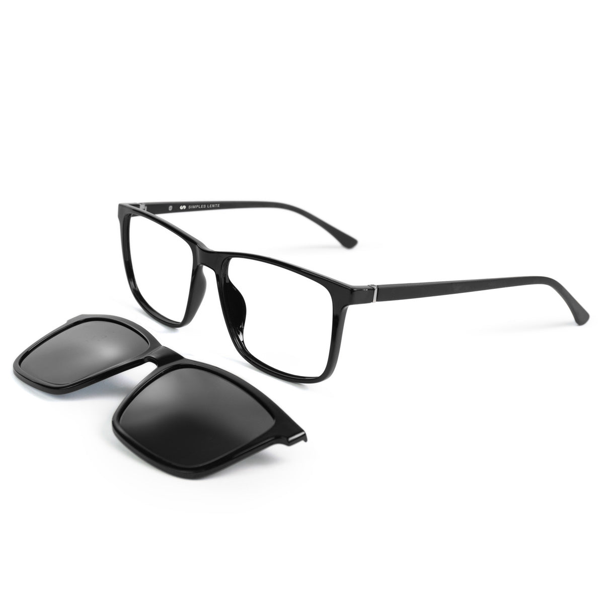 Design quadrado grande clássico com clip-on que transforma seu óculos de grau em óculos solar.