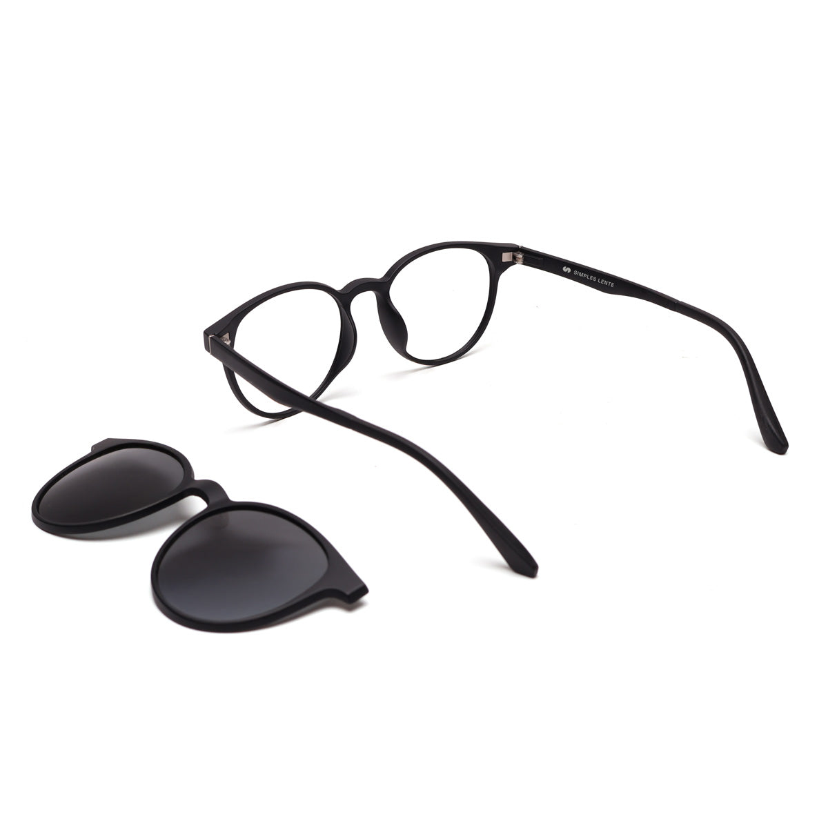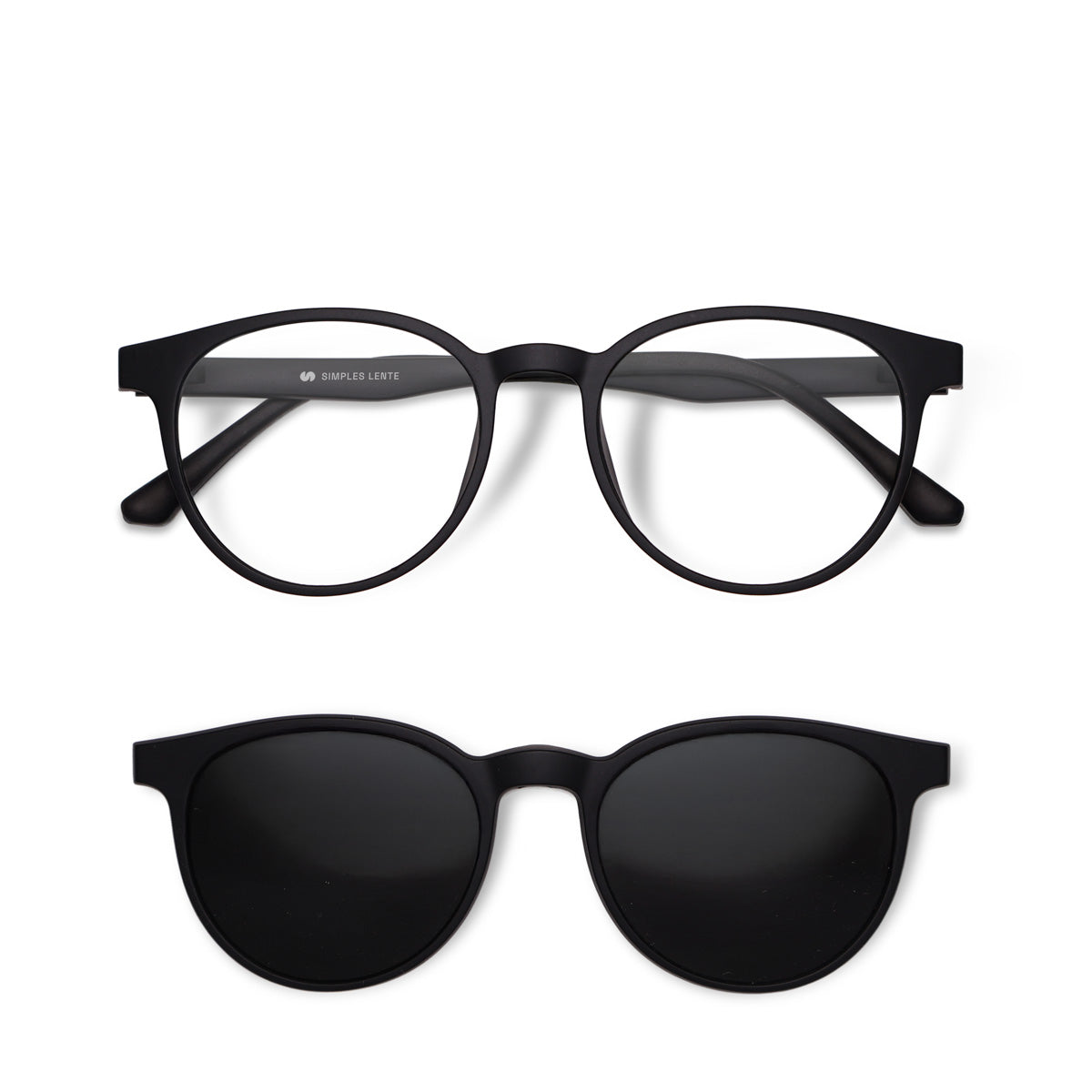 Design redondo clássico com clip-on que transforma seu óculos de grau em óculos solar.