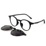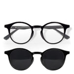 Design redondo clássico com clip-on que transforma seu óculos de grau em óculos solar.