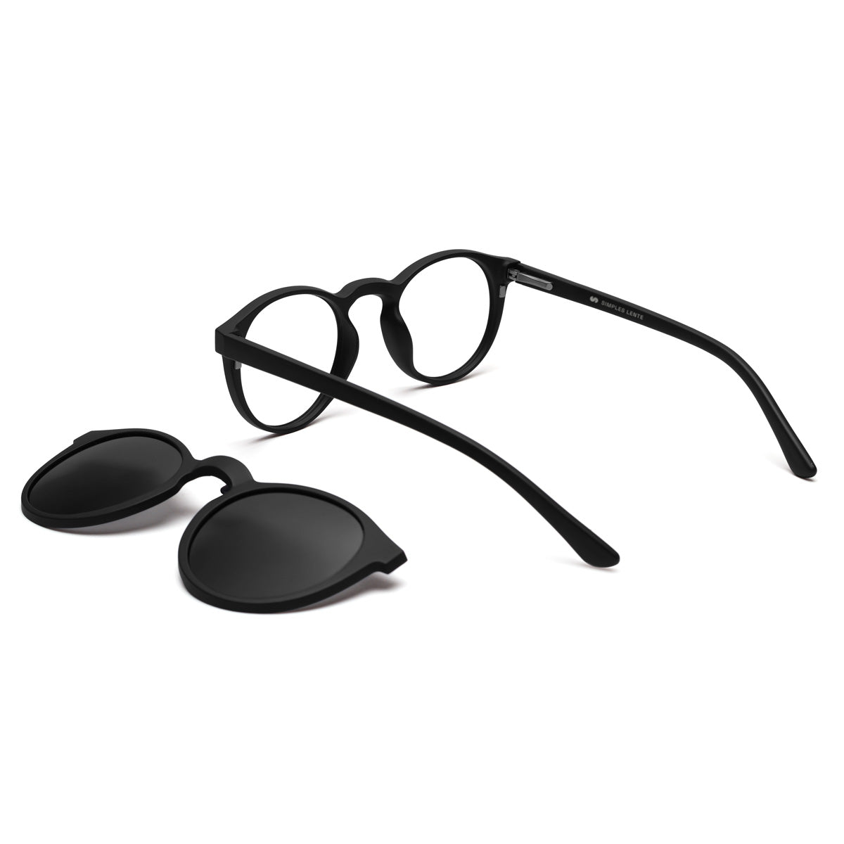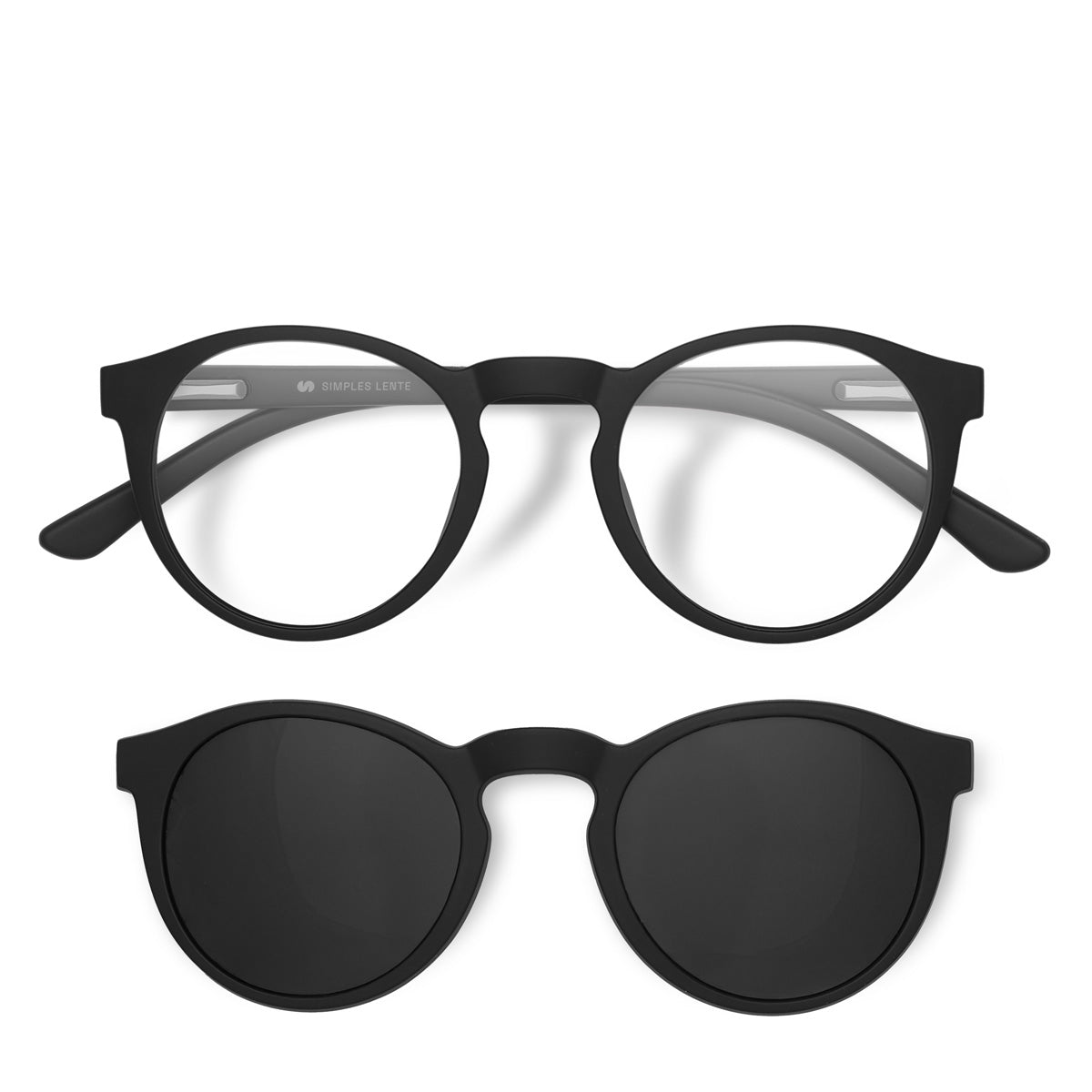 Design redondo clássico com clip-on que transforma seu óculos de grau em óculos solar.