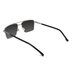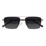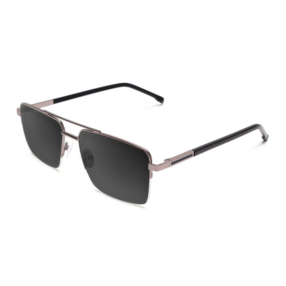 Óculos de metal aviador quadrado, de tamanho médio. Leve e versátil, seu design icônico apresenta uma estrutura resistente e confortável. Possui plaquetas flexíveis de silicone e ponteiras de acetato nas hastes, garantindo um ajuste preciso para diferentes formatos de rosto e nariz.
