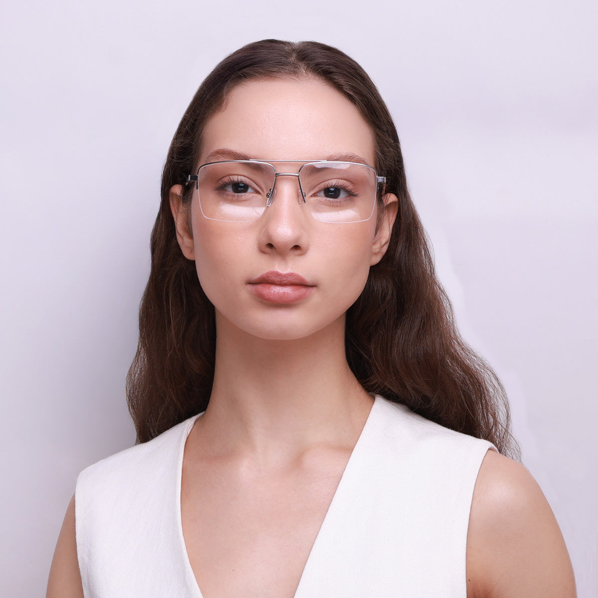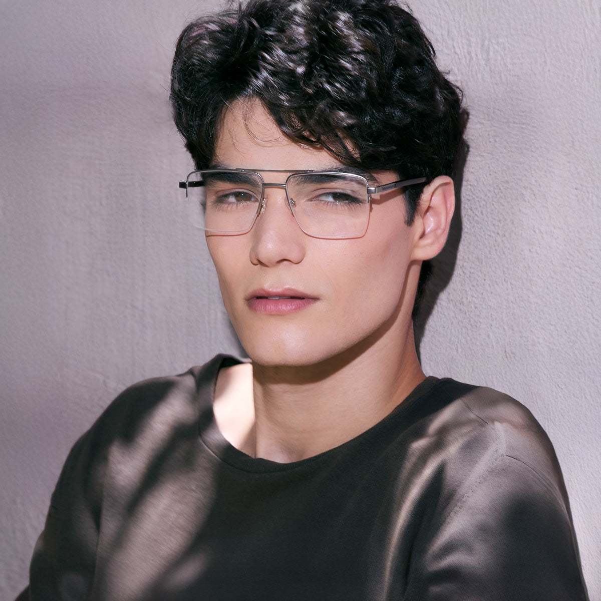 Óculos de metal aviador quadrado, de tamanho médio. Leve e versátil, seu design icônico apresenta uma estrutura resistente e confortável. Possui plaquetas flexíveis de silicone e ponteiras de acetato nas hastes, garantindo um ajuste preciso para diferentes formatos de rosto e nariz.