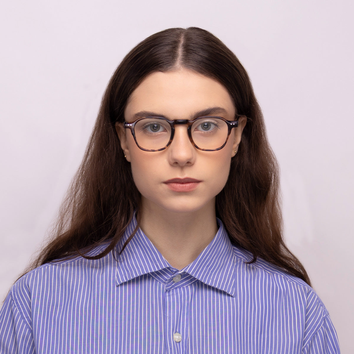 Óculos Quadrado Pequeno F3 Tartaruga em modelo com rosto pequeno.