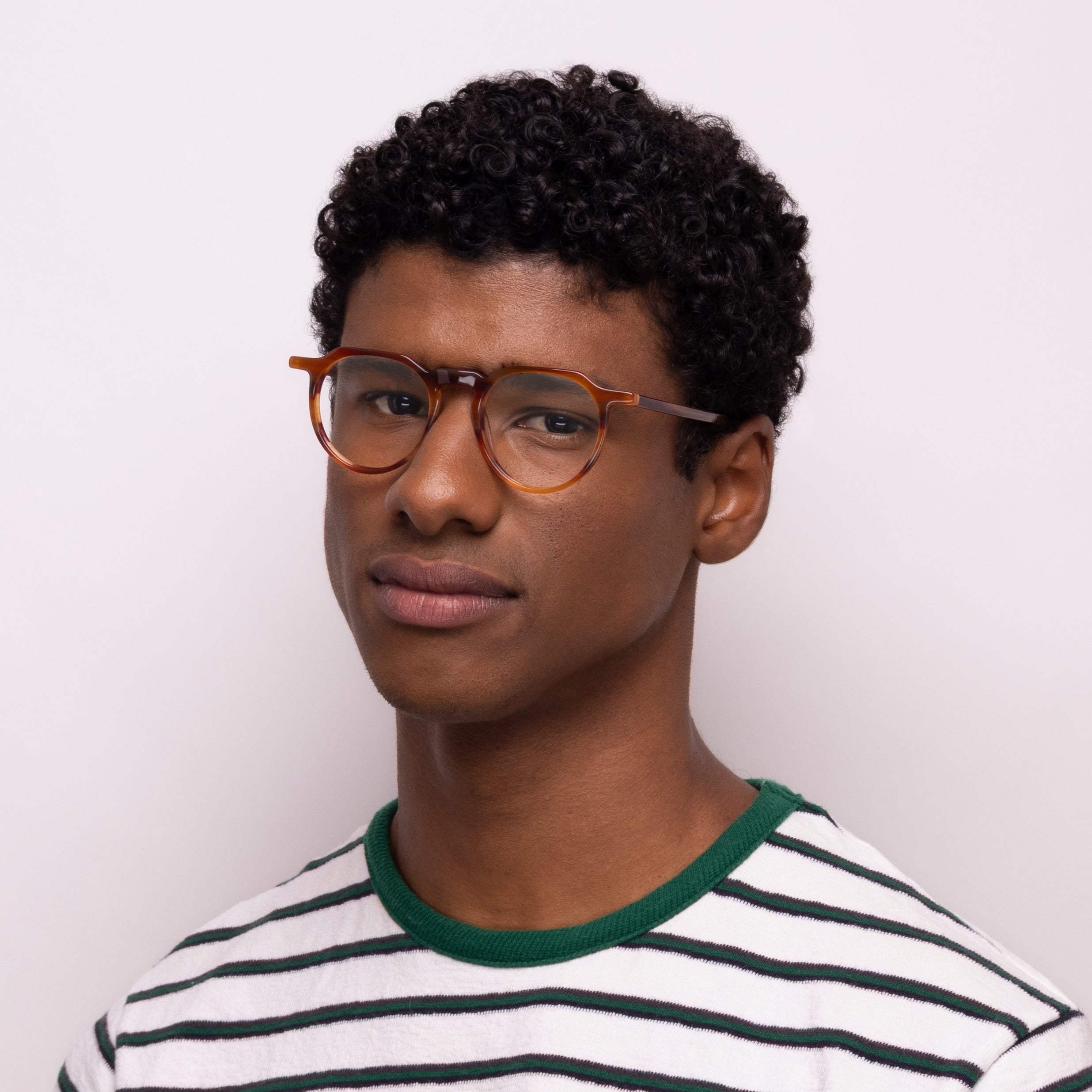 Óculos Redondo Médio B20 Caramelo em modelo com rosto médio.