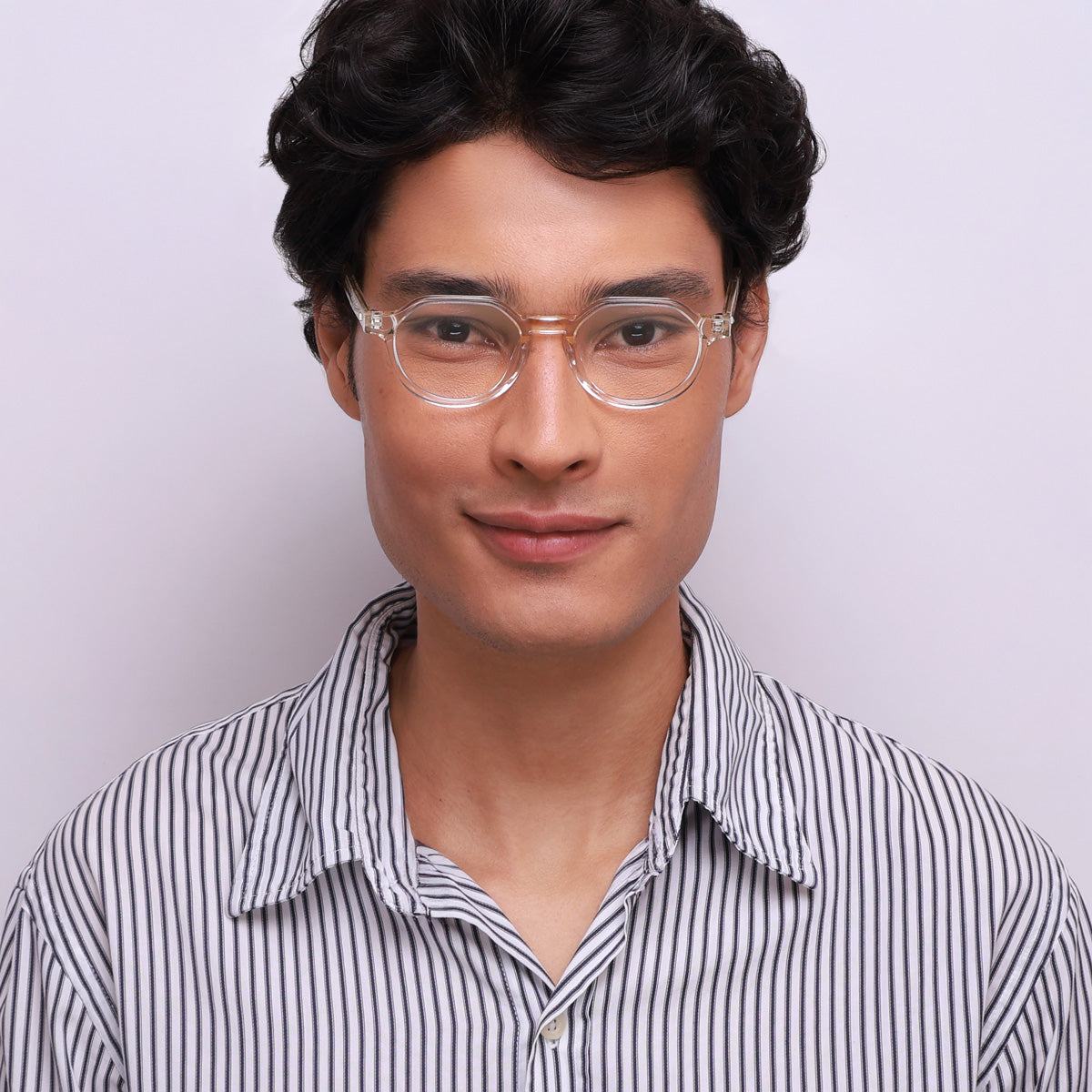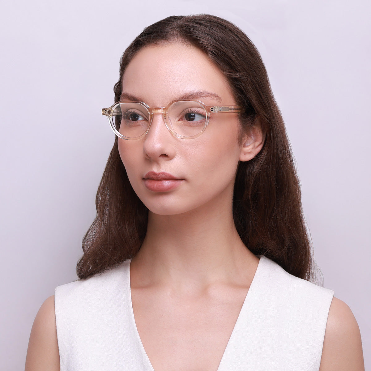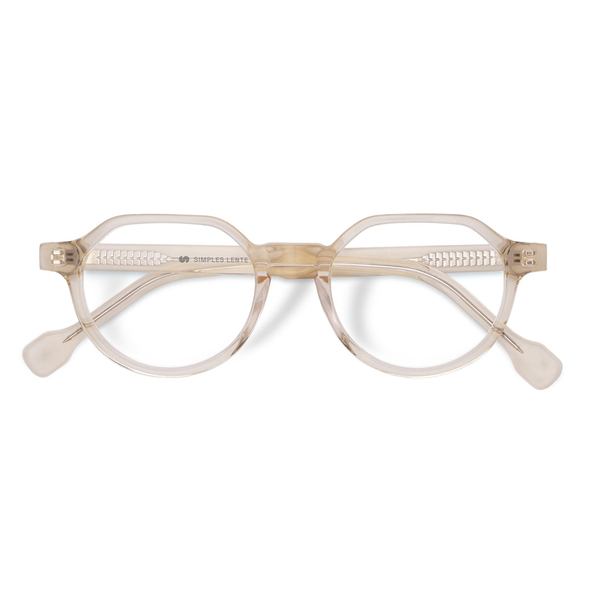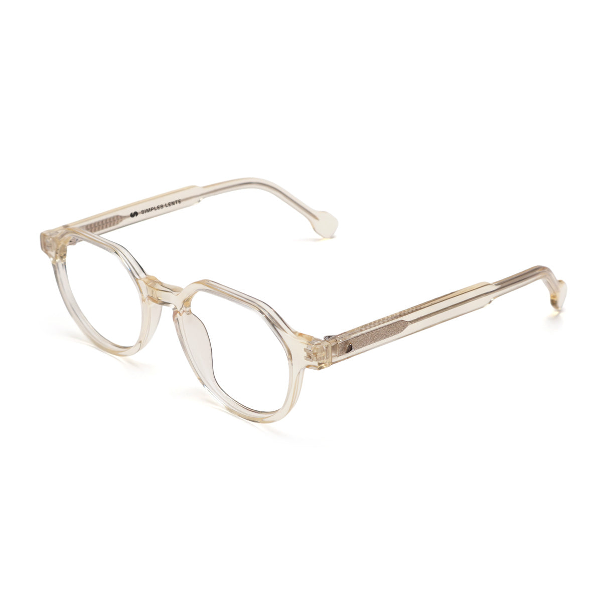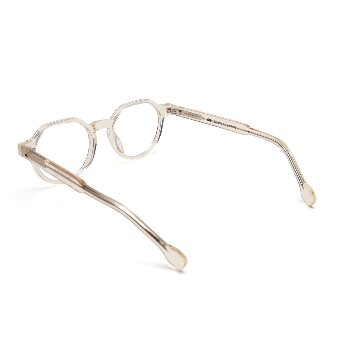 Óculos de Acetato Premium na cor champanhe translúcido.