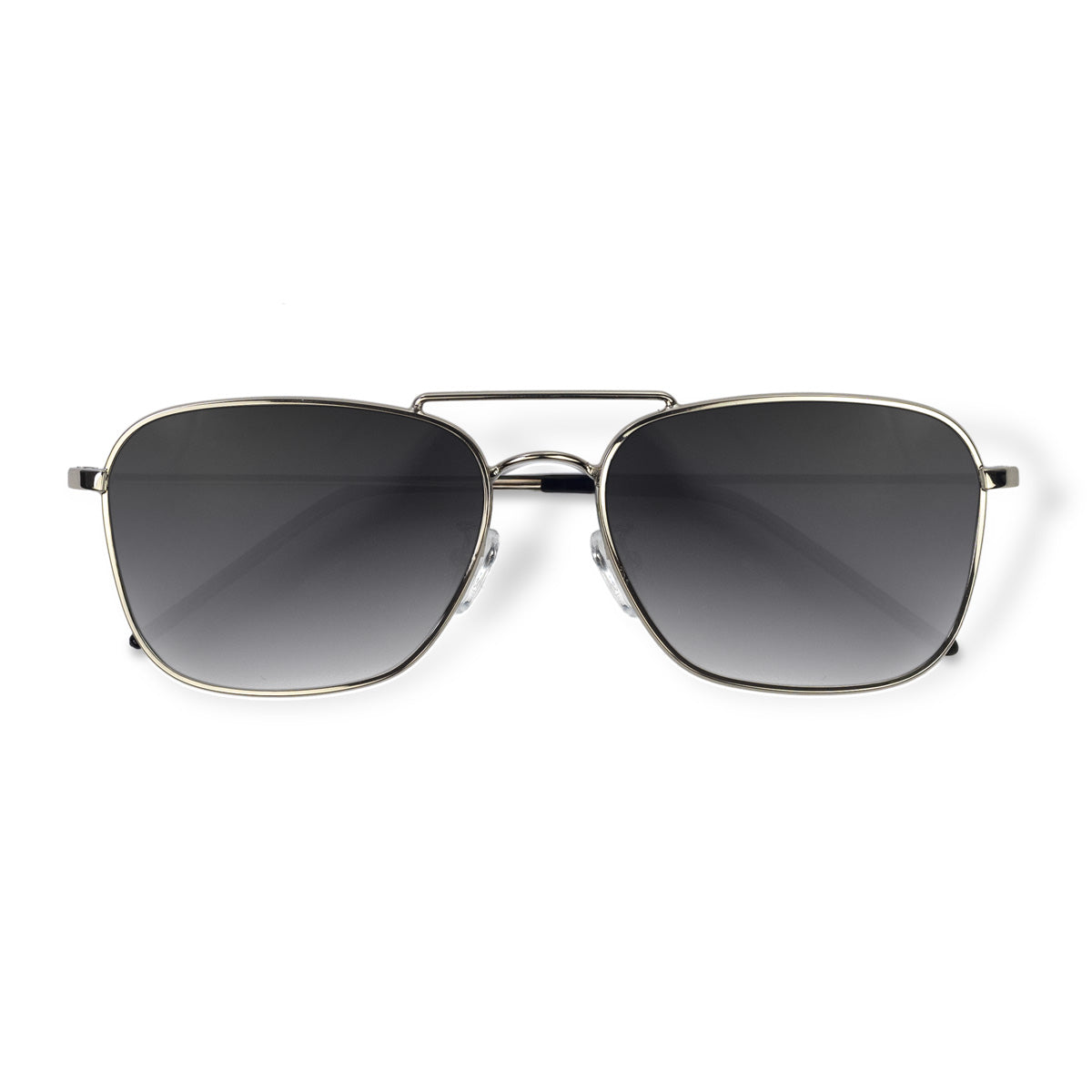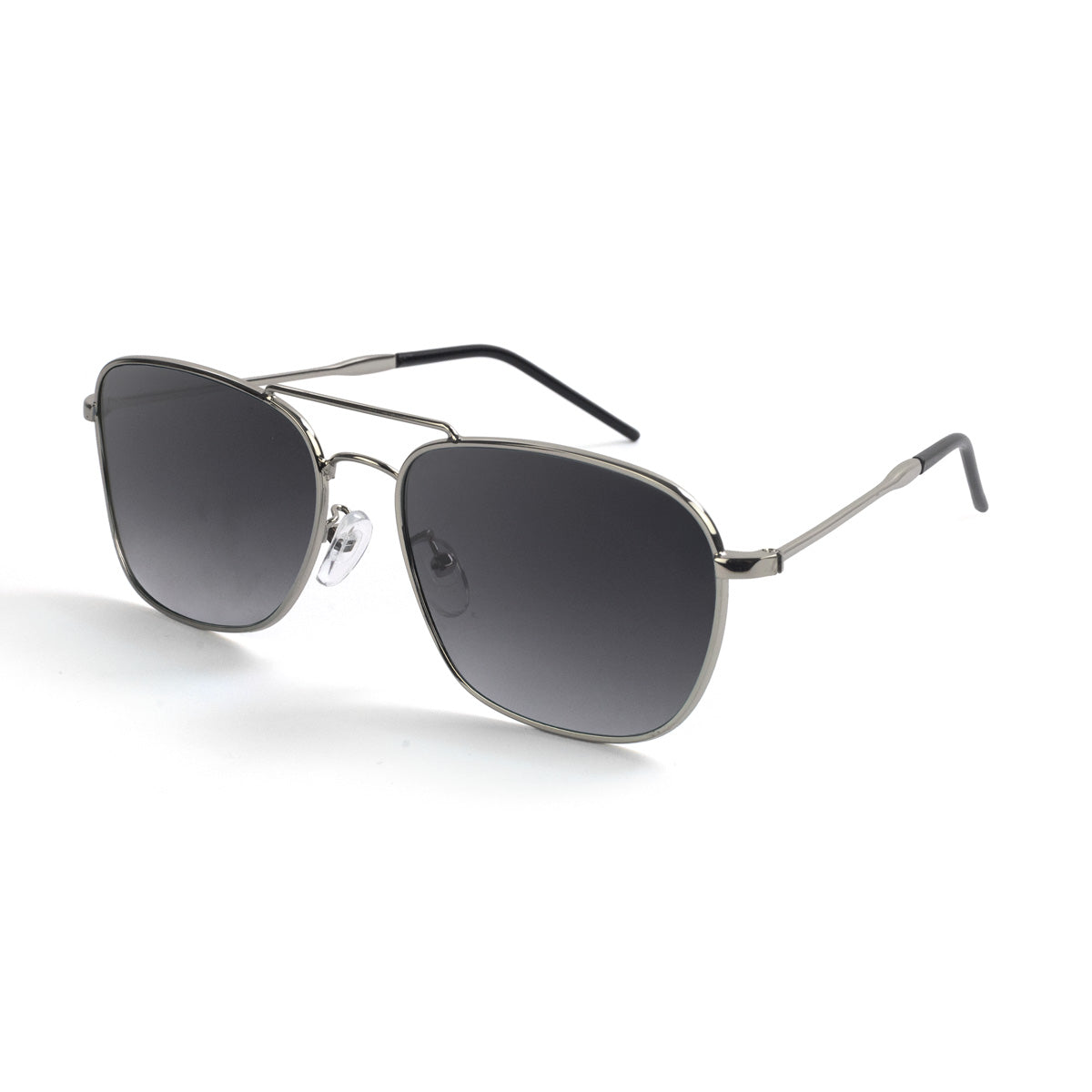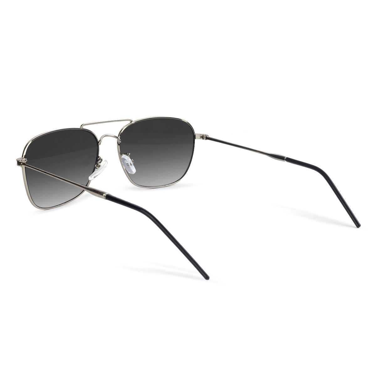 Óculos de metal aviador quadrado com lente reversa, de tamanho médio. Leve e versátil, seu design icônico apresenta estrutura resistente e confortável. Possui plaquetas flexíveis de silicone e ponteiras de acetato nas hastes, garantindo um ajuste preciso para diferentes formatos de rosto e nariz.