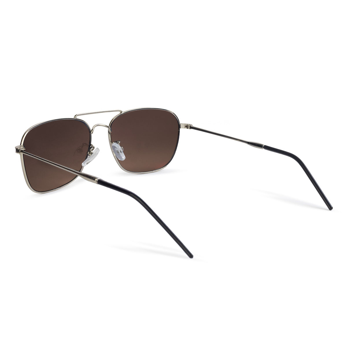 Óculos de metal aviador quadrado com lente reversa, de tamanho médio. Leve e versátil, seu design icônico apresenta estrutura resistente e confortável. Possui plaquetas flexíveis de silicone e ponteiras de acetato nas hastes, garantindo um ajuste preciso para diferentes formatos de rosto e nariz.