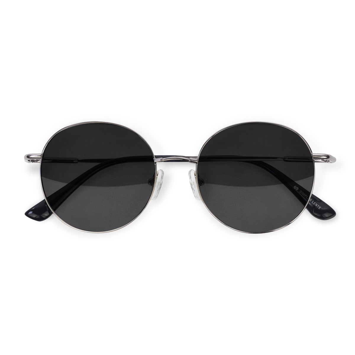 Óculos de metal titanium leve e discreto com design redondo clássico. Possui plaquetas flexíveis de silicone e ponteira de acetato na haste que permite se adaptar bem a diferentes rostos e narizes.