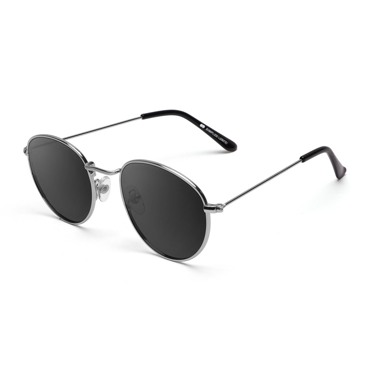 Óculos em metal leve e resistente, com design redondo clássico e atemporal. Equipado com plaquetas flexíveis de silicone e ponteiras de acetato nas hastes, oferece excelente adaptabilidade e conforto para diversos tipos de rosto e formatos de nariz.